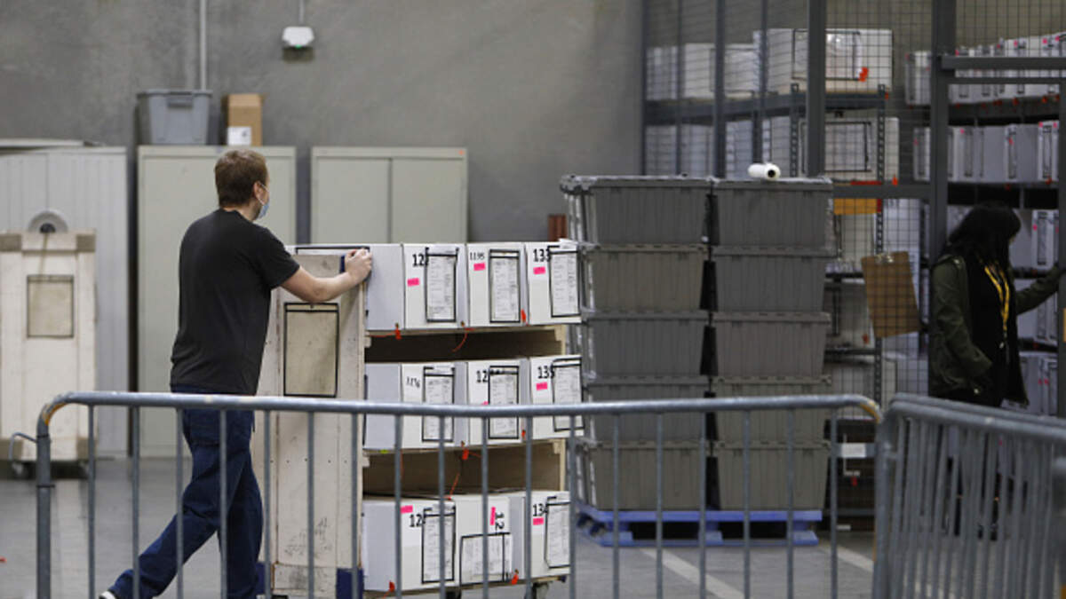 A worker pushes a cart with boxes of ballots at the Clark County Election Department in North Las Vegas, Nevada, U.S., on Thursday, Nov. 5, 2020. Democratic nominee Joe Biden is closing in on the 270 electoral votes he needs to win the presidency, while President Donald Trumps path to re-election has narrowed. Biden needs a win in one more state -- Pennsylvania, Georgia, Nevada or North Carolina -- provided that other race calls stand. Photographer: Joe Buglewicz/Bloomberg via Getty Images